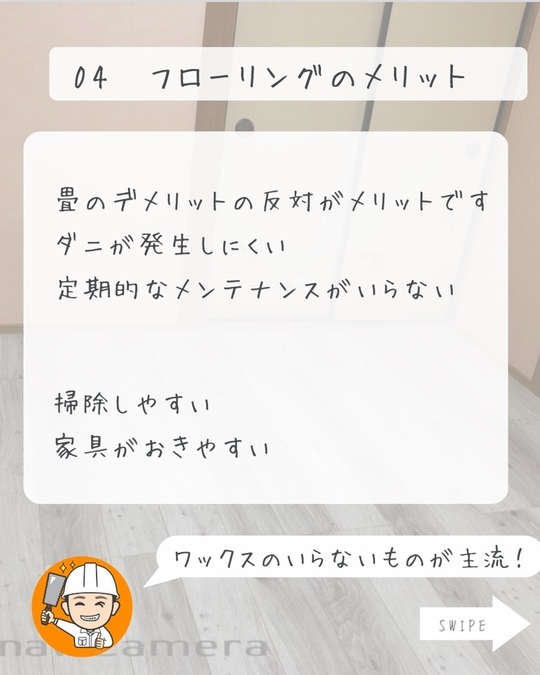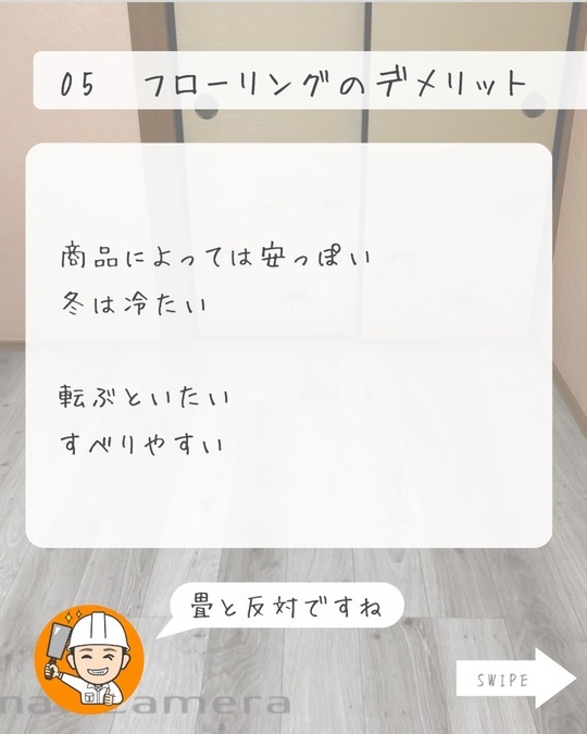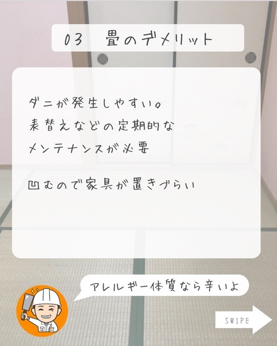 日本の住まいに馴染み深い「畳」ですが、現代のライフスタイルに本当に合っているか、一度見直してみませんか? 畳の香りや和の雰囲気には魅力がありますが、毎日の掃除やメンテナンス、ダニやカビのリスクを考えると、フローリングの方が実用的な選択かもしれません。