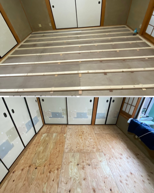 畳の厚さの分まで床を持ち上げてきます。(必要に応じてここで断熱材を施工。下記の参考料金表には断熱材の価格を含んでおります。)