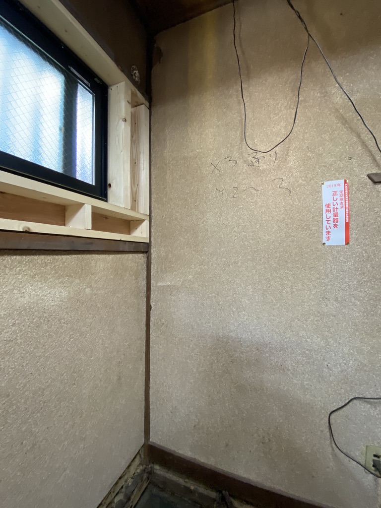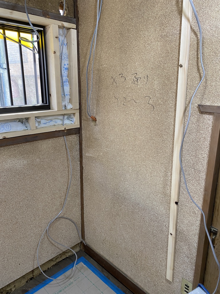 ・壁は土壁と石こうボードが混在し、下地の通りや固さにムラ(耐震補強工事も同時進行なので壁に文字があります。)