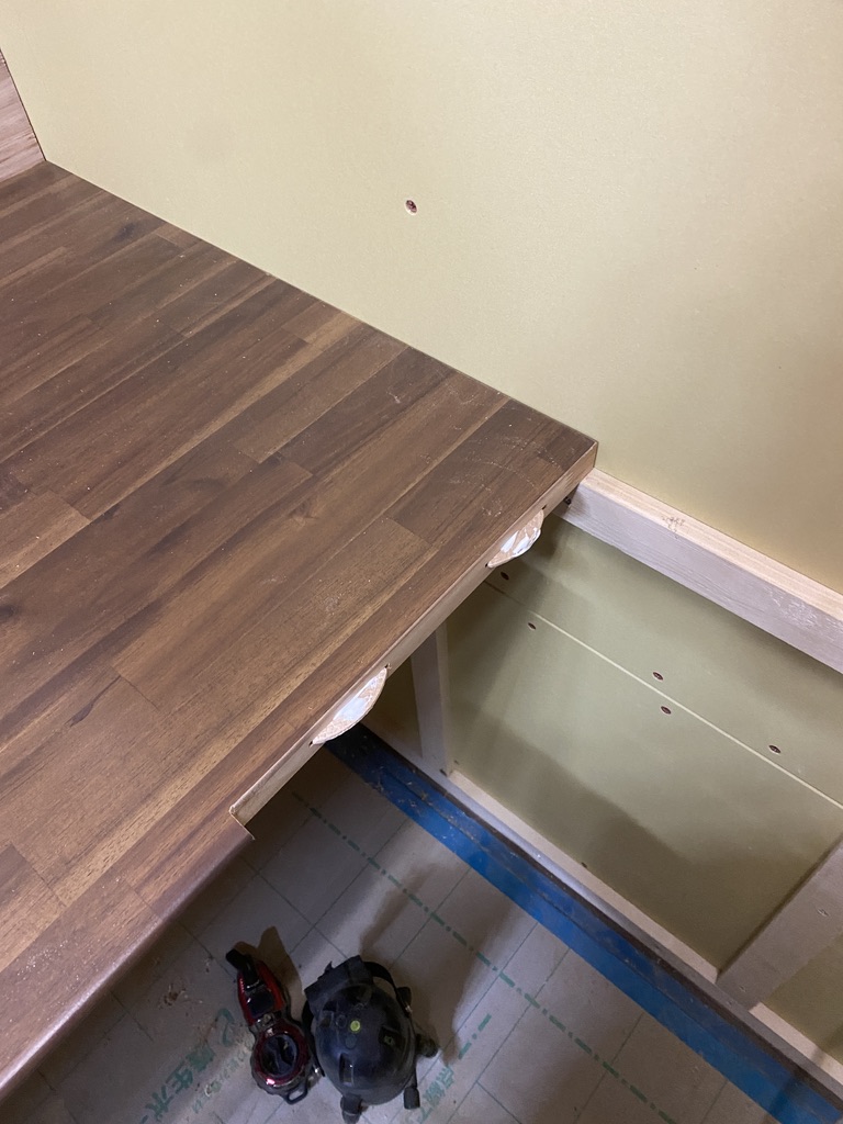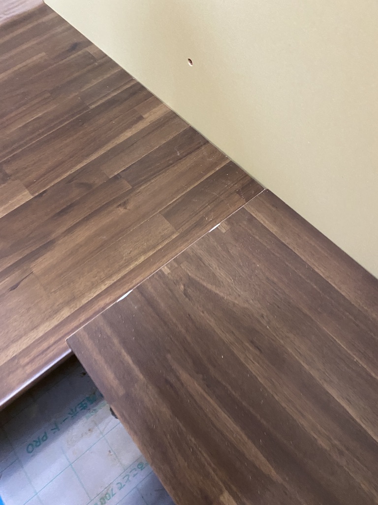 ・天板は現地合わせでL字に加工。ビスケットジョイントで段差と反りを抑え、一体天板として仕上げ